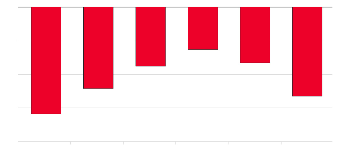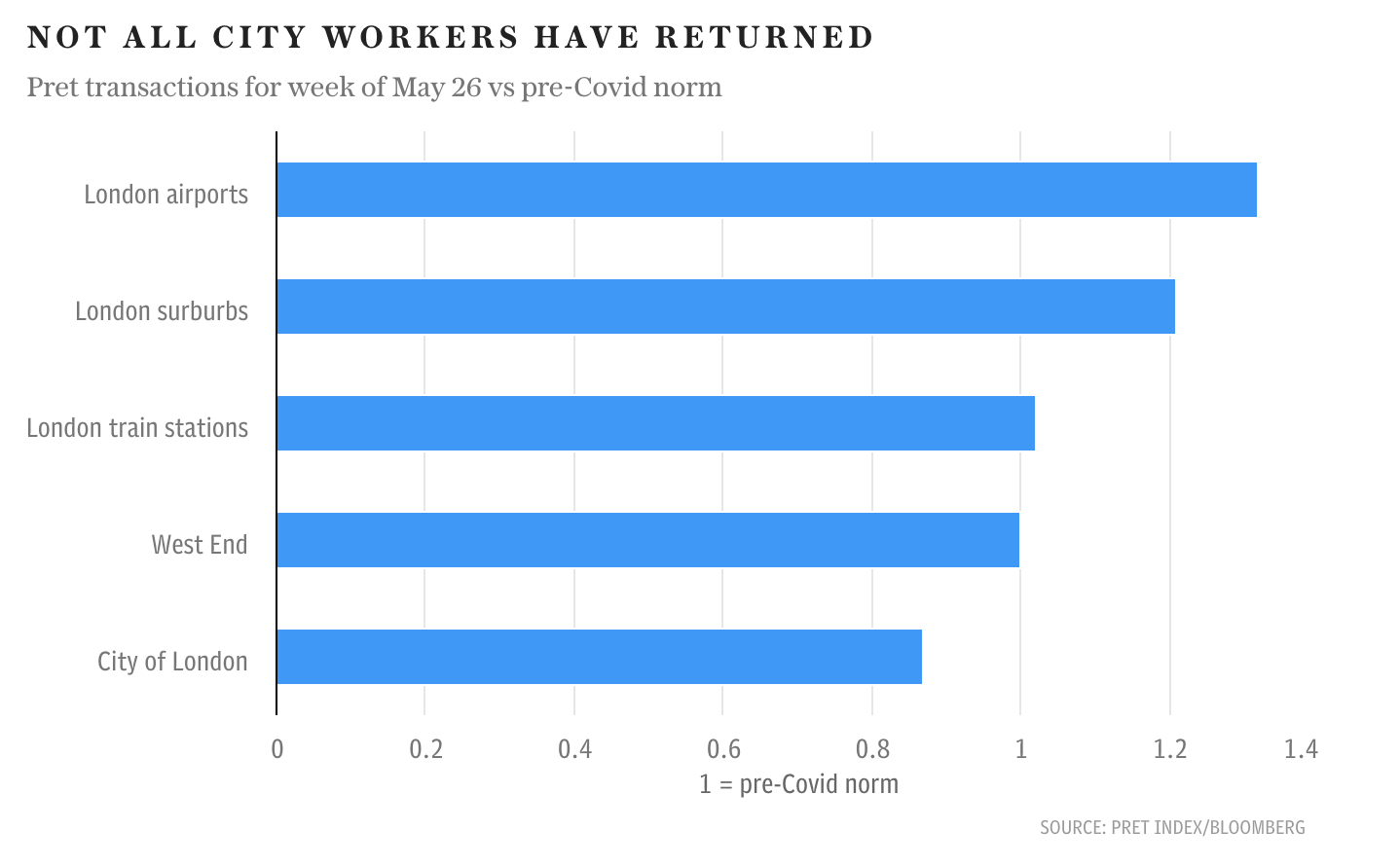 Not all city workers have returned a Bar chart with 5 bars. Pret transactions for the week of May 26 vs pre-Covid norm